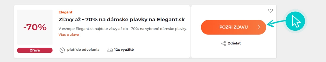 Vyberte si na našej stránke konkrétnu Elegant zľavu a kliknite na tlačidlo „Pozri zľavu“. Automaticky budete presmerovaný priamo na akciovú ponuku v internetovom obchode Elegant.sk, kde môžete produkt nakúpiť so zľavou.