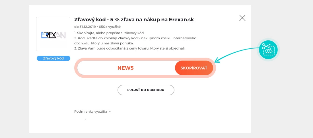 Skopírujte alebo si odpíšte zľavový kód a kliknite na tlačidlo „Prejsť do obchodu“. Následne budete presmerovaný priamo do e-shopu Erexan.sk
