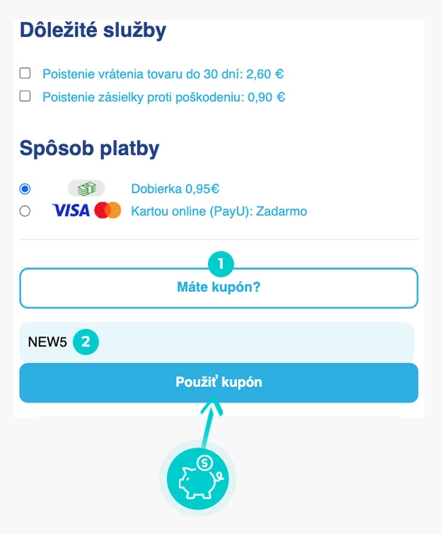 Vyberte si produkt v e-shope Erexan.sk, o ktorý máte záujem, stlačte tlačidlo „Do košíka“ a produkt sa automaticky vloží do nákupného košíka. Priamo v nákupnom košíku nájdete pod výberom spôsobu platby políčko „Máte kupón? Kliknite sem pre zadanie kódu“. Tu vložte skopírovaný zľavový kód alebo ho ručne vpíšte a potvrďte tlačidlom „Použiť kupón“.