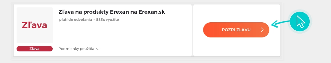 Vyberte si na našej stránke konkrétnu Erexan zľavu a kliknite na tlačidlo „Pozri zľavu“. Automaticky budete presmerovaný priamo na akciovú ponuku v internetovom obchode Erexan.sk, kde môžete produkt nakúpiť so zľavou.