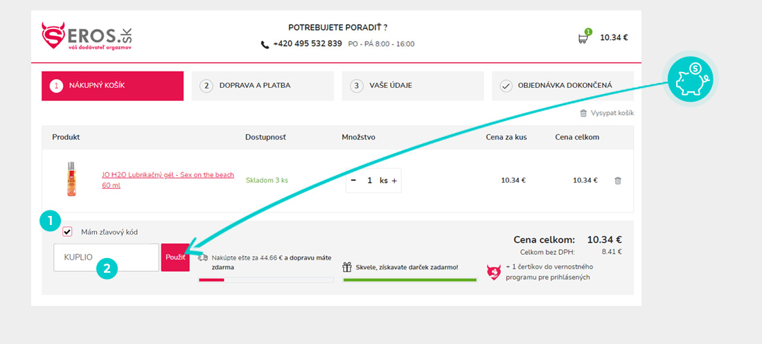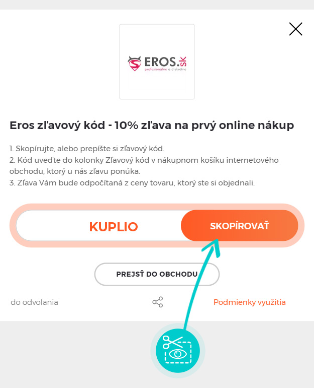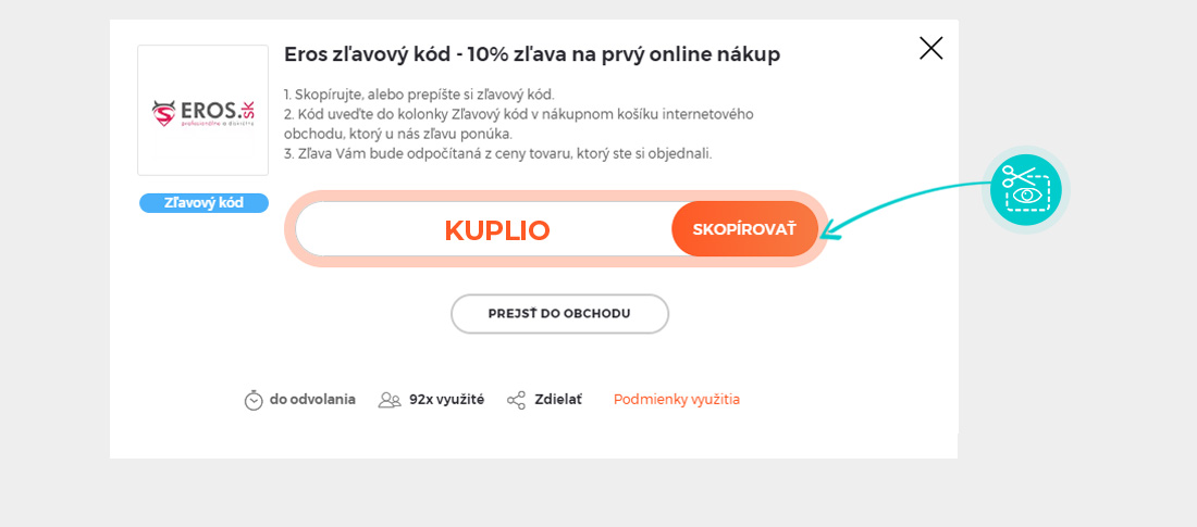 Skopírujte alebo si odpíšte zľavový kód a kliknite na tlačidlo „Prejsť do obchodu“. Následne budete presmerovaný priamo do e-shopu Eros.sk.