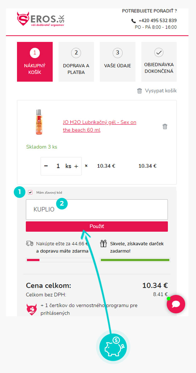 Vyberte si produkt v e-shope Eros.sk, o ktorý máte záujem, stlačte tlačidlo „Do košíka“ a produkt sa automaticky vloží do nákupného košíka. Priamo v nákupnom košíku nájdete v prvom kroku objednávania pod zoznamom objednávaných produktov vľavo dole políčko „Mám zľavový kód“. Tu vložte skopírovaný zľavový kód alebo ho ručne vpíšte a potvrďte tlačidlom „Použiť“.