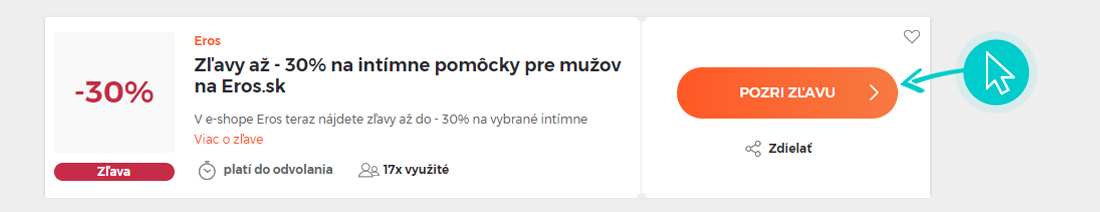 Vyberte si na našej stránke konkrétnu Eros zľavu a kliknite na tlačidlo „Pozri zľavu“. Automaticky budete presmerovaný priamo na akciovú ponuku v internetovom obchode Eros.sk, kde môžete produkt nakúpiť so zľavou.