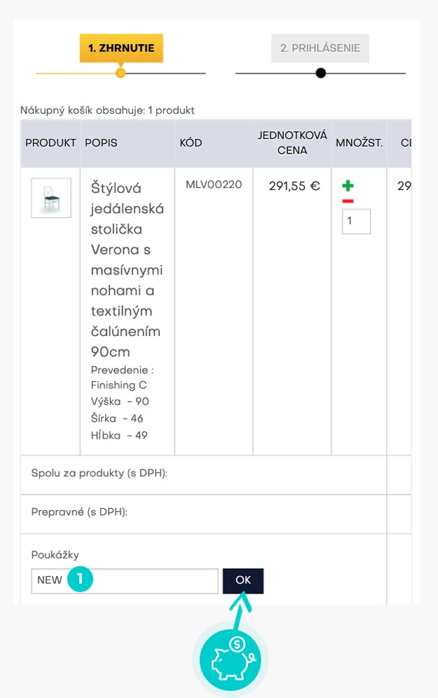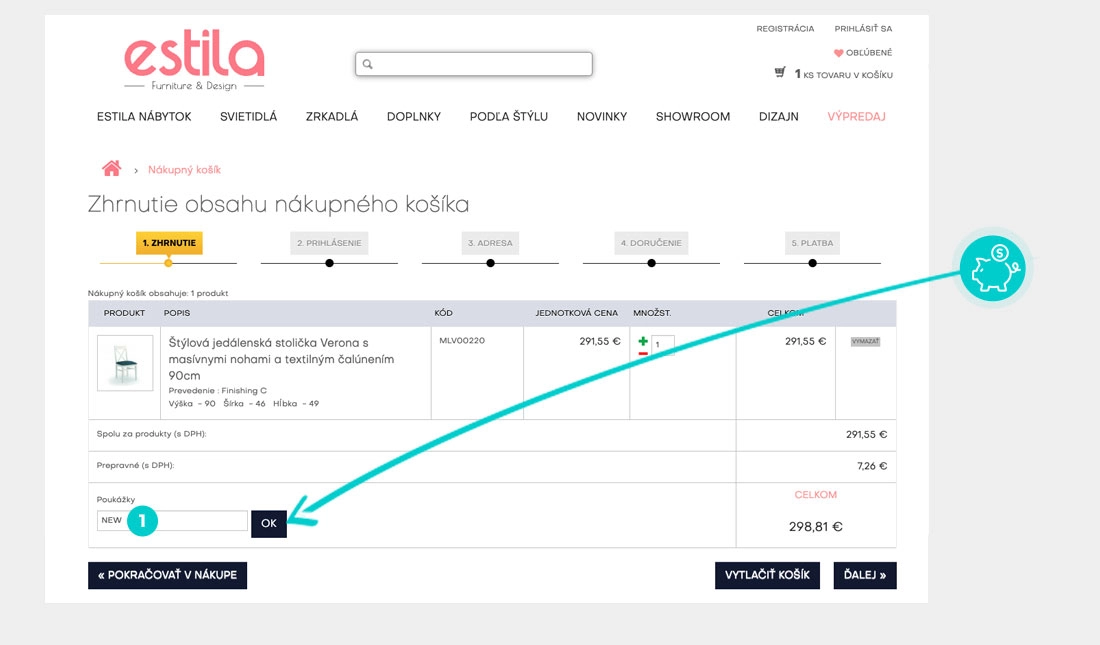 Vyberte si produkt v e-shope Estila.sk, o ktorý máte záujem, stlačte tlačidlo „Do košíka“ a produkt sa automaticky vloží do nákupného košíka. Priamo v nákupnom košíku nájdete v pravej časti políčko „Poukážky“. Tu vložte skopírovaný zľavový kód alebo ho ručne vpíšte a potvrďte tlačidlom „OK“.