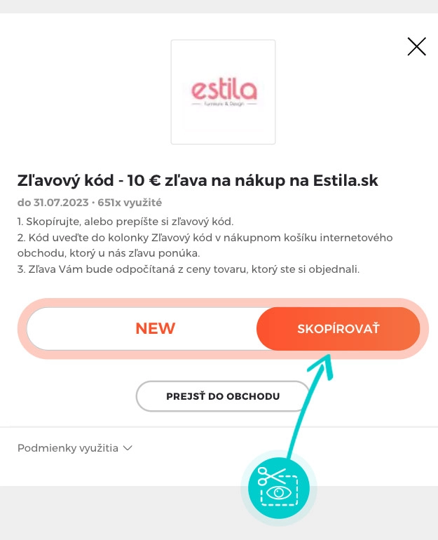 Skopírujte alebo si odpíšte zľavový kód a kliknite na tlačidlo „Prejsť do obchodu“. Následne budete presmerovaný priamo do e-shopu Estila.sk.