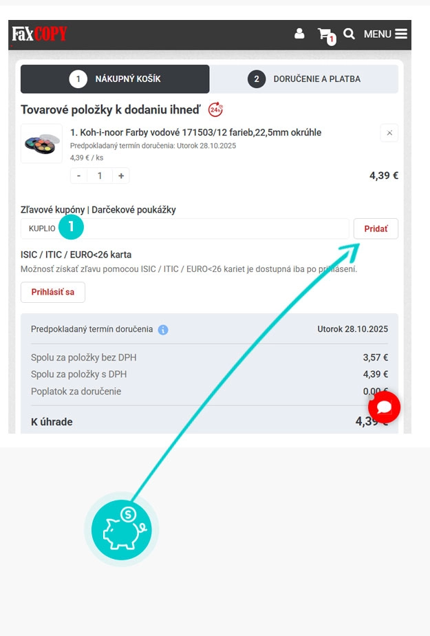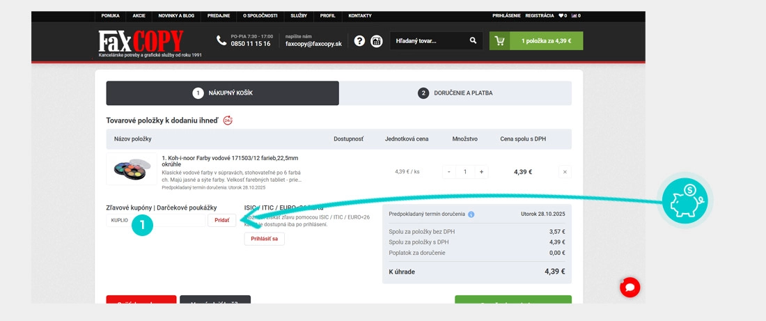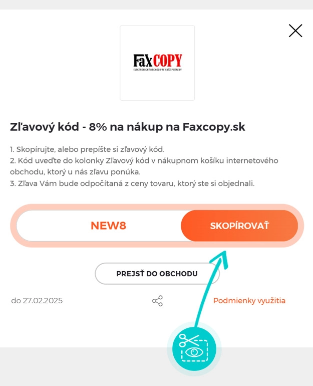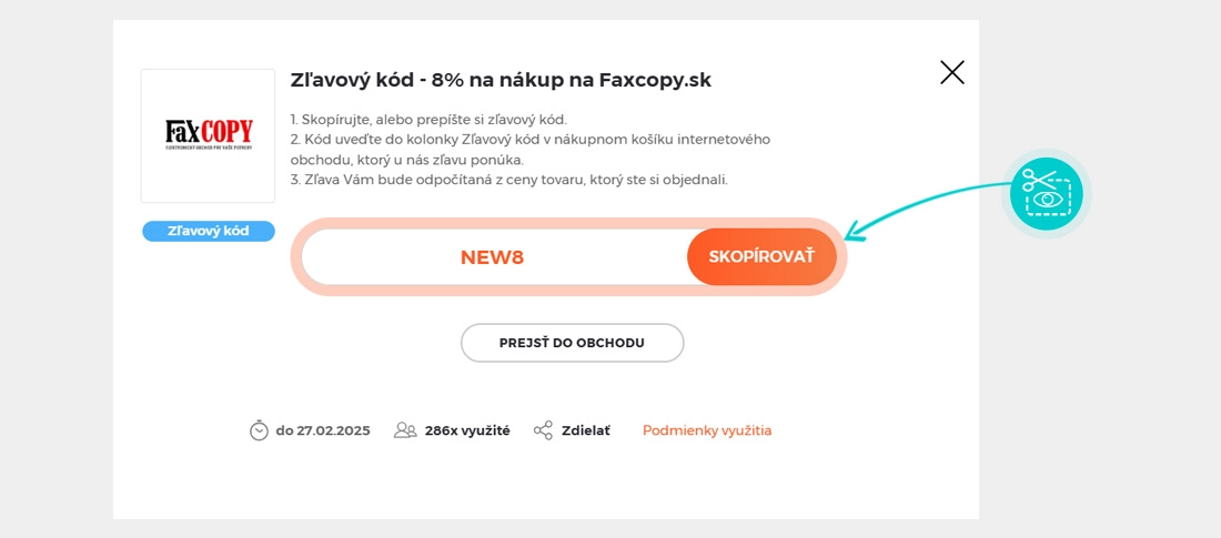 Skopírujte alebo si odpíšte zľavový kód a kliknite na tlačidlo „Prejsť do obchodu“. Následne budete presmerovaný priamo do e-shopu Faxcopy.sk.