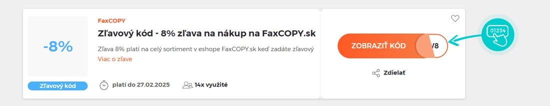 Vyberte si konkrétny zľavový kód na našej stránke, ktorý si chcete uplatniť v e-shope Faxcopy.sk. Kliknite na oranžové tlačidlo „Zobraziť kód“.