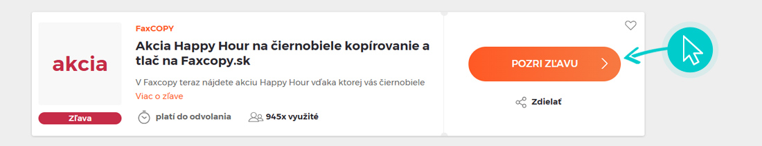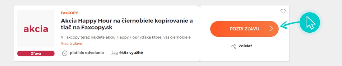 Vyberte si na našej stránke konkrétnu Faxcopy zľavu a kliknite na tlačidlo „Pozri zľavu“. Automaticky budete presmerovaný priamo na akciovú ponuku v internetovom obchode Faxcopy.sk, kde môžete produkt nakúpiť so zľavou.
