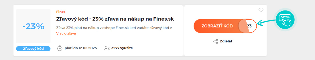 Vyberte si konkrétny zľavový kód na našej stránke, ktorý si chcete uplatniť v e-shope Fines.sk. Kliknite na oranžové tlačidlo „Zobraziť kód“.