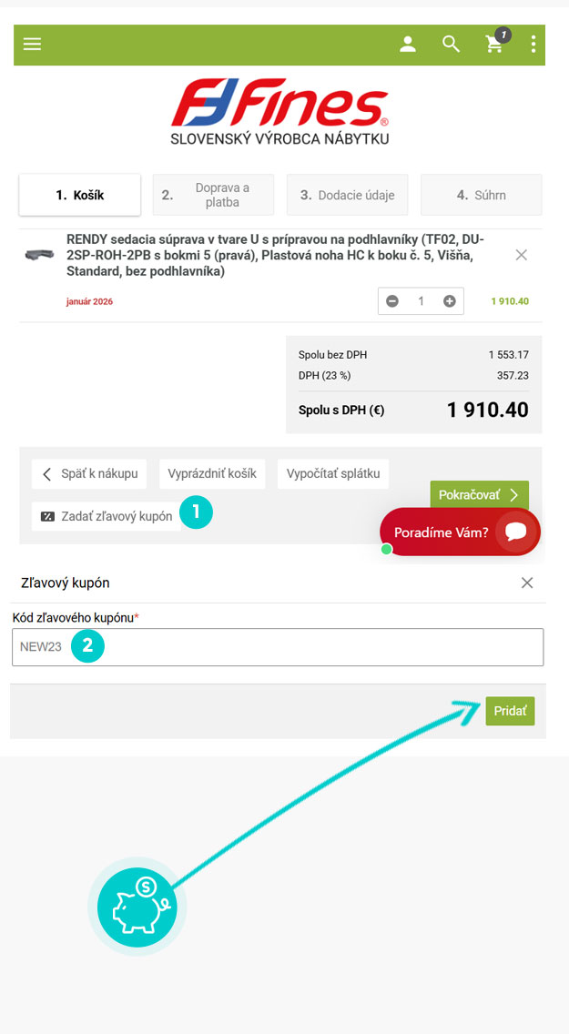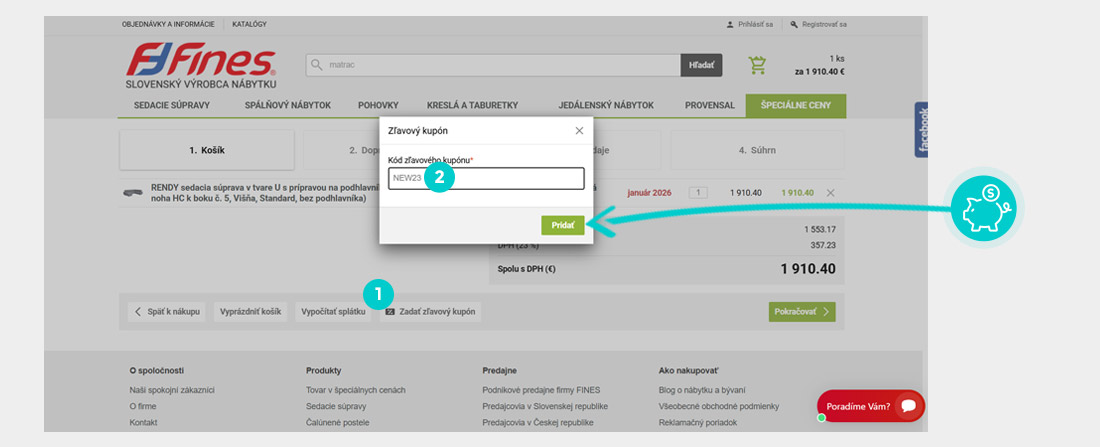 Vyberte si produkt v e-shope Fines.sk, o ktorý máte záujem, stlačte tlačidlo „Do košíka“ a produkt sa automaticky vloží do nákupného košíka. Priamo v nákupnom košíku nájdete v prvom kroku objednávania pod zoznamom objednávaných produktov políčko „Zadať zľavový kupón“. Tu vložte skopírovaný zľavový kód alebo ho ručne vpíšte a potvrďte tlačidlom „Pridať“.