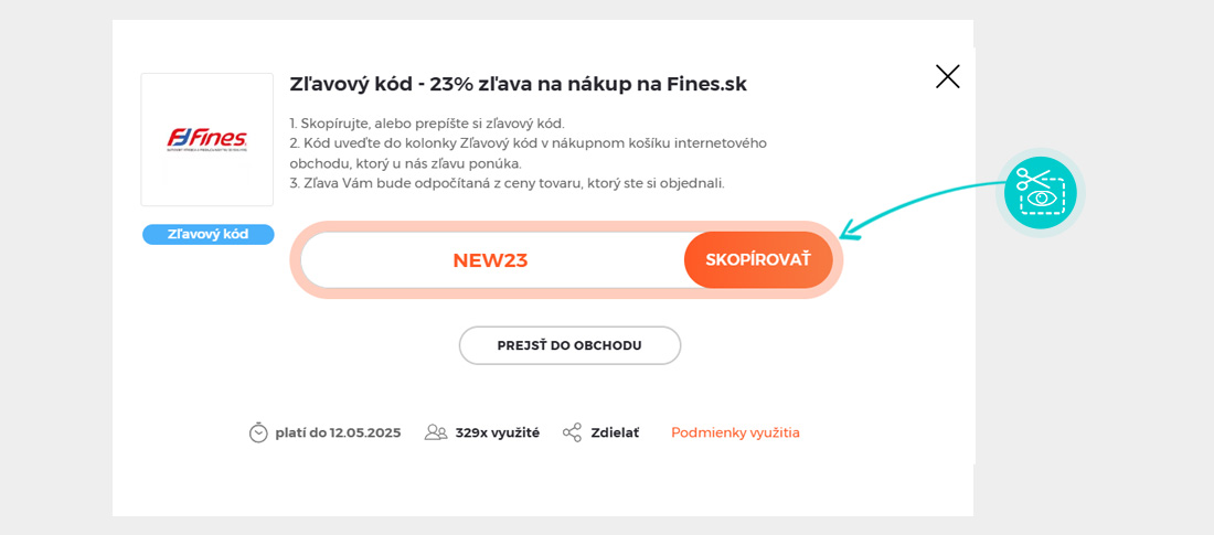 Skopírujte alebo si odpíšte zľavový kód a kliknite na tlačidlo „Prejsť do obchodu“. Následne budete presmerovaný priamo do e-shopu Fines.sk.