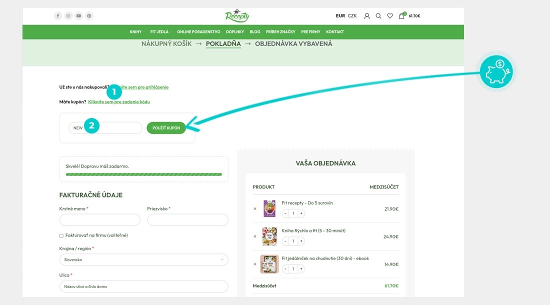 Vyberte si produkt v e-shope Fitrecepty.sk, o ktorý máte záujem, stlačte tlačidlo „Pridať do košíka“ a produkt sa automaticky vloží do nákupného košíka. Priamo v nákupnom košíku nájdete pod Vami vybraným produktom políčko „Kód kupónu“. Tu vložte skopírovaný zľavový kód alebo ho ručne vpíšte a potvrďte tlačidlom „Použiť kupón“.