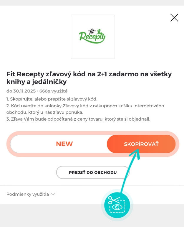 Skopírujte alebo si odpíšte zľavový kód a kliknite na tlačidlo „Prejsť do obchodu“. Následne budete presmerovaný priamo do e-shopu Fitrecepty.sk.