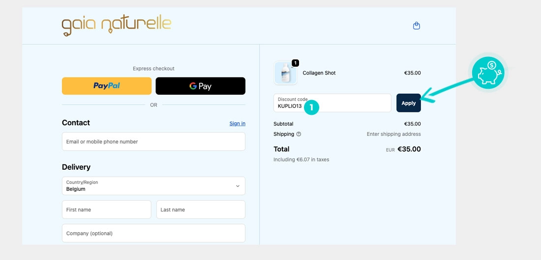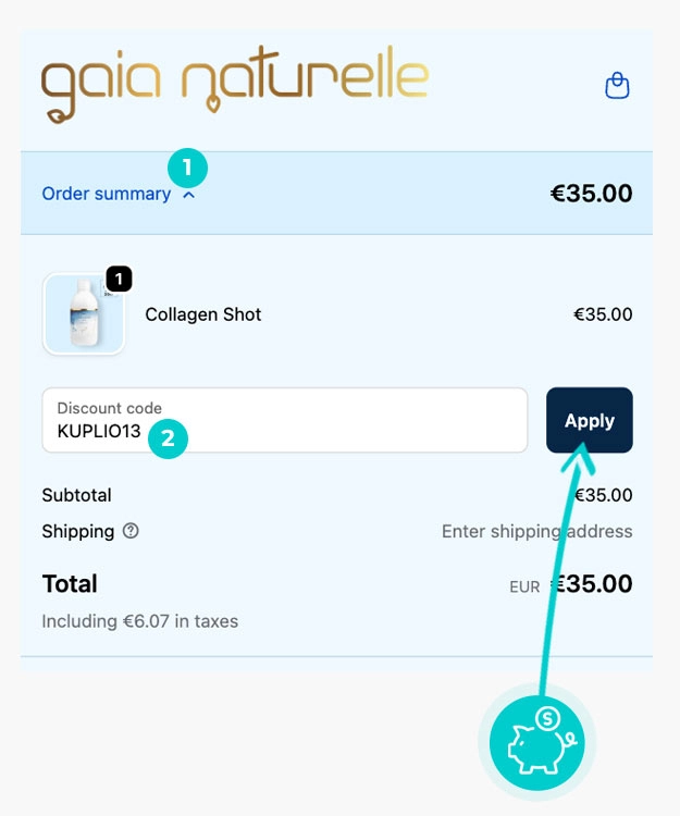 Vyberte si produkt v e-shope Gaianaturelle.eu, o ktorý máte záujem, stlačte tlačidlo „Add to cart“ a produkt sa automaticky vloží do nákupného košíka. Priamo v nákupnom košíku nájdete pod Vami vybraným produktom políčko „Discount code“. Tu vložte skopírovaný zľavový kód alebo ho ručne vpíšte a potvrďte tlačidlom „Apply“.