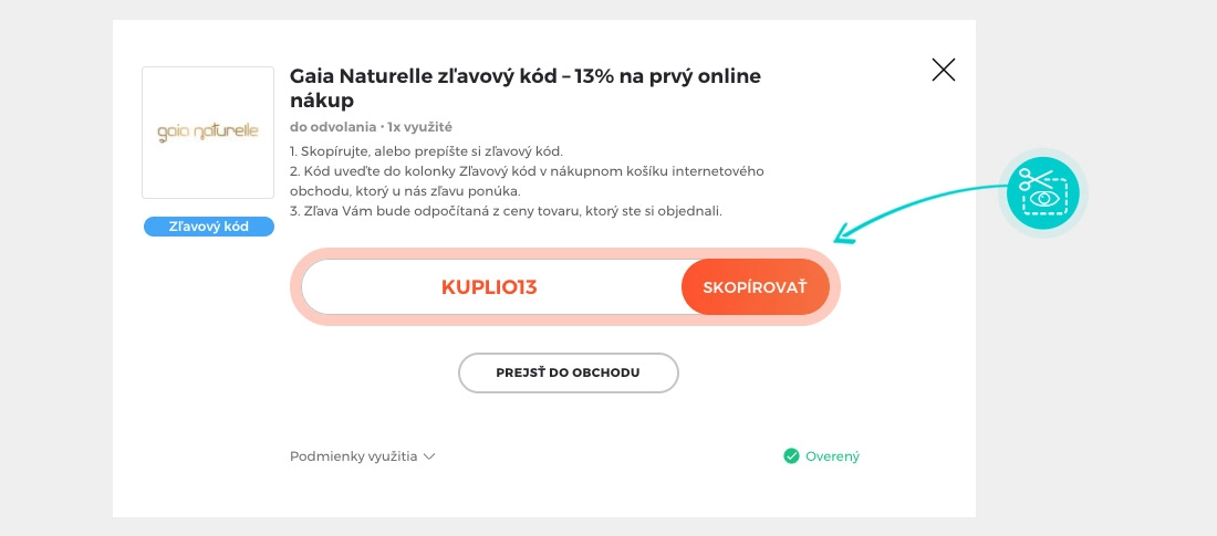 Skopírujte alebo si odpíšte zľavový kód a kliknite na tlačidlo „Prejsť do obchodu“. Následne budete presmerovaný priamo do e-shopu Gaianaturelle.eu.