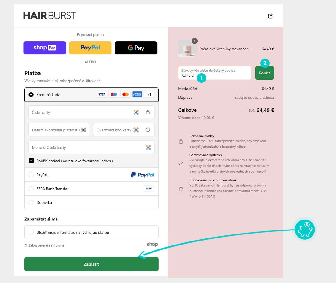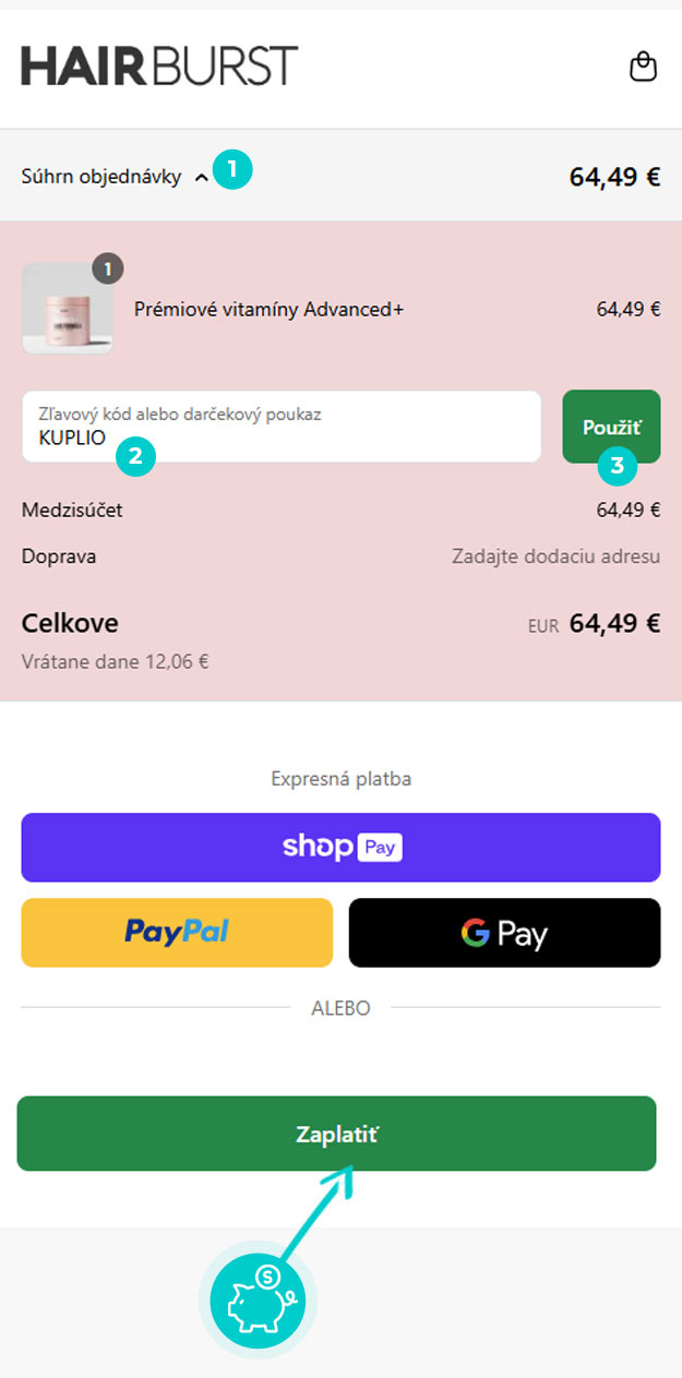 Vyberte si produkt v e-shope Hairbust.com, o ktorý máte záujem, stlačte tlačidlo „Pridať do košíka“ a produkt sa automaticky vloží do nákupného košíka. Priamo v nákupnom košíku nájdete pod Vami vybraným produktom políčko „Zľavový kód alebo darčekový poukaz“. Tu vložte skopírovaný zľavový kód alebo ho ručne vpíšte a potvrďte tlačidlom „Použiť“.