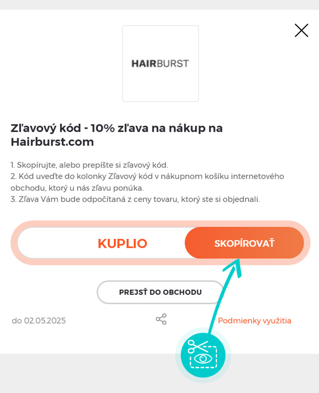 Skopírujte alebo si odpíšte zľavový kód a kliknite na tlačidlo „Prejsť do obchodu“. Následne budete presmerovaný priamo do e-shopu Hairbust.com.