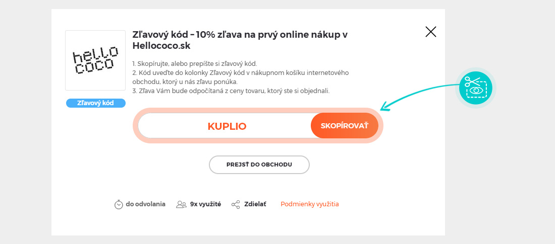 Skopírujte alebo si odpíšte zľavový kód a kliknite na tlačidlo „Prejsť do obchodu“. Následne budete presmerovaný priamo do e-shopu Hellococo.sk.
