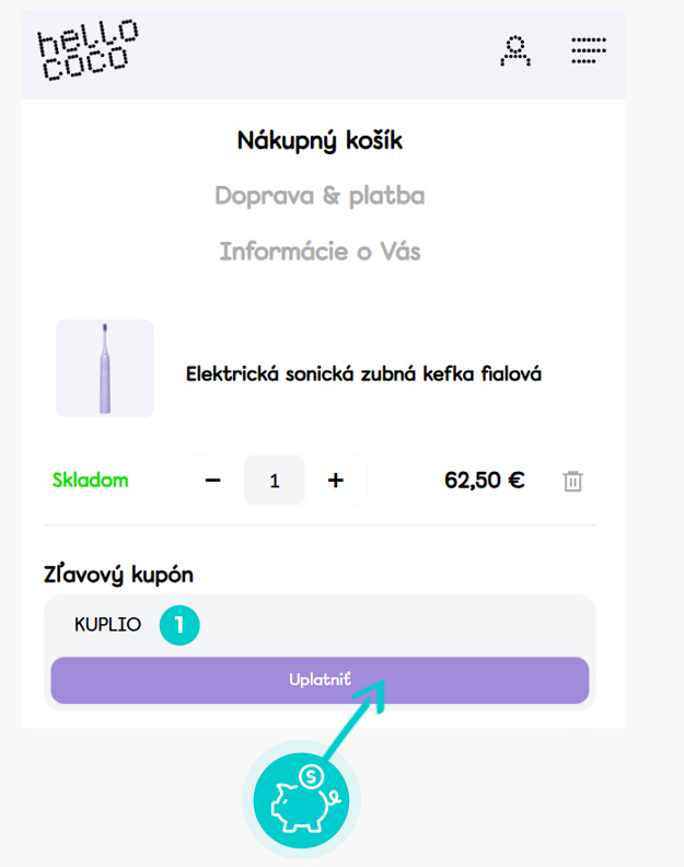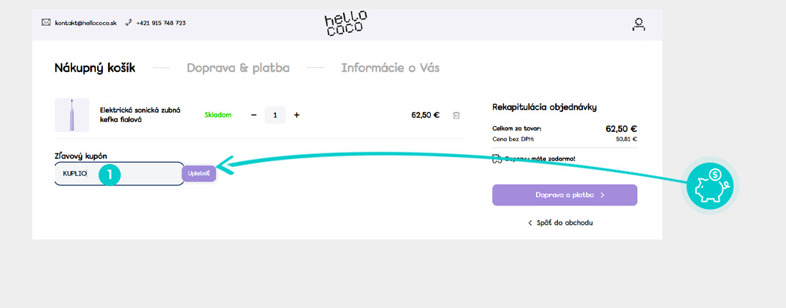 Vyberte si produkt v e-shope Hellococo.sk, o ktorý máte záujem, stlačte tlačidlo „Do košíka“ a produkt sa automaticky vloží do nákupného košíka. Priamo v nákupnom košíku nájdete pod Vami vybraným produktom políčko „Vložiť zľavový kupón“. Tu vložte skopírovaný zľavový kód alebo ho ručne vpíšte a potvrďte tlačidlom „Uplatniť“.