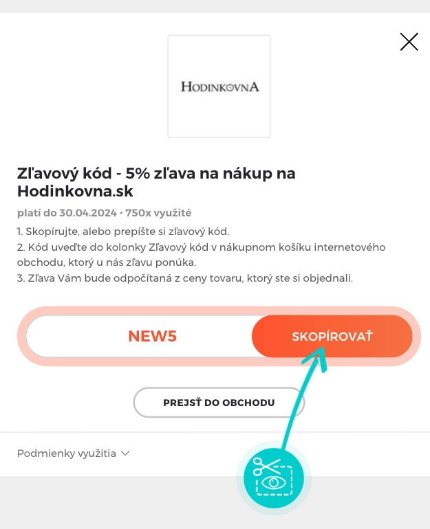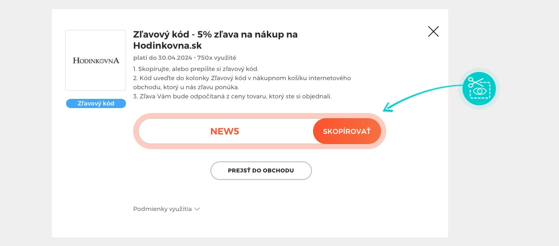 Skopírujte alebo si odpíšte zľavový kód a kliknite na tlačidlo „Prejsť do obchodu“. Následne budete presmerovaný priamo do e-shopu Hodinkovna.sk.