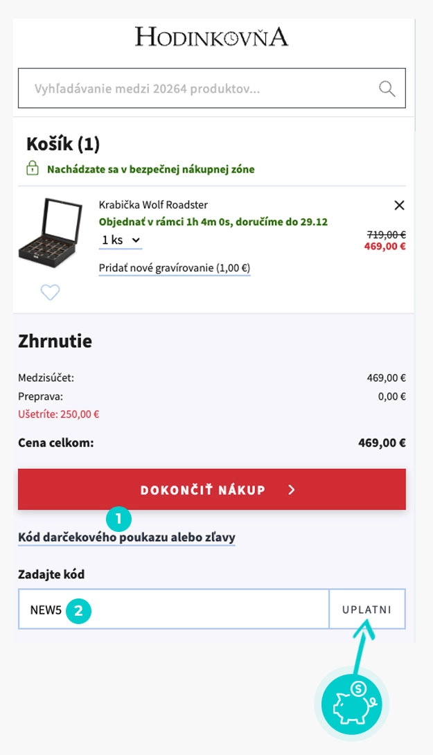 Vyberte si produkt v e-shope Hodinkovna.sk, o ktorý máte záujem, stlačte tlačidlo „Do košíka“ a produkt sa automaticky vloží do nákupného košíka. Priamo v nákupnom košíku nájdete v pravej časti políčko „Zadajte kód“. Tu vložte skopírovaný zľavový kód alebo ho ručne vpíšte a potvrďte tlačidlom „Uplatni“.