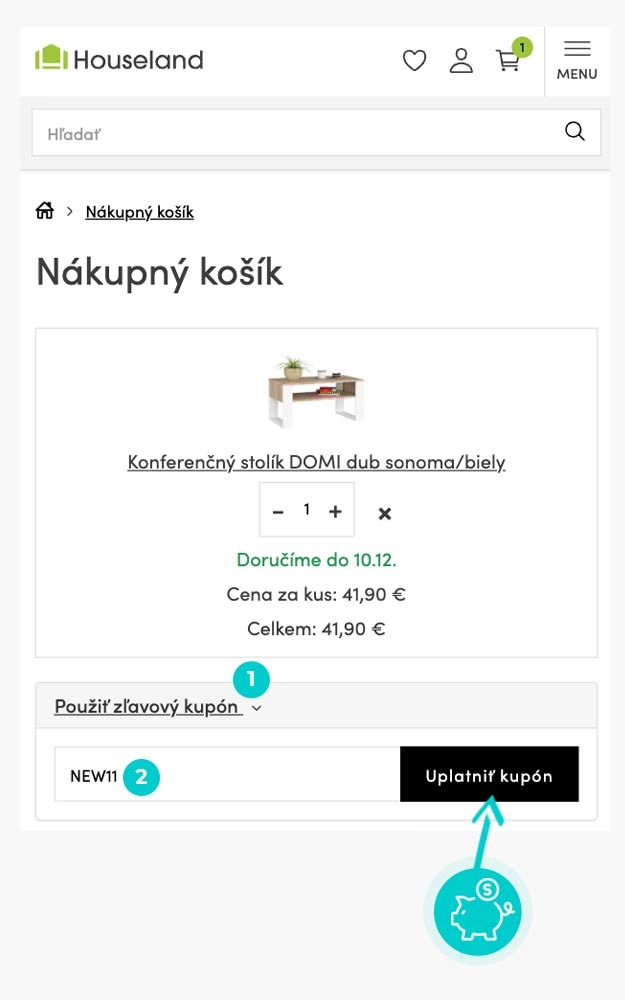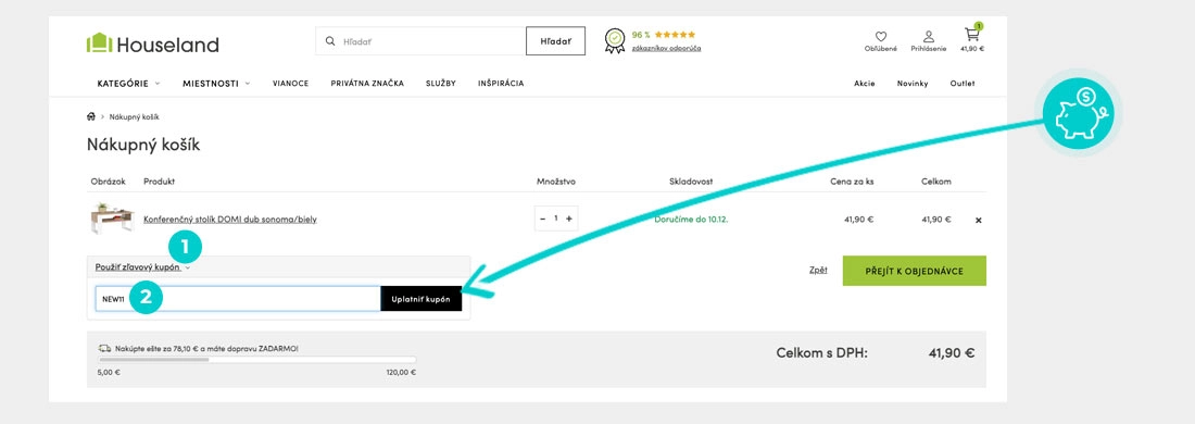 Vyberte si produkt v eshope Houseland.sk, o ktorý máte záujem, stlačte tlačidlo „Do košíka“ a produkt sa automaticky vloží do nákupného košíka. Priamo v nákupnom košíku nájdete pod Vami vybraným produktom políčko „Použiť zľavový kupón“. Tu vložte skopírovaný zľavový kód alebo ho ručne vpíšte a potvrďte tlačidlom „Uplatniť kupón“.