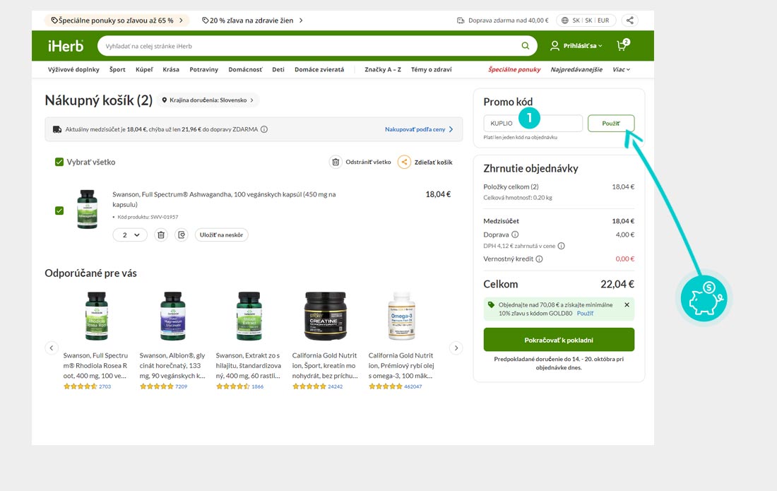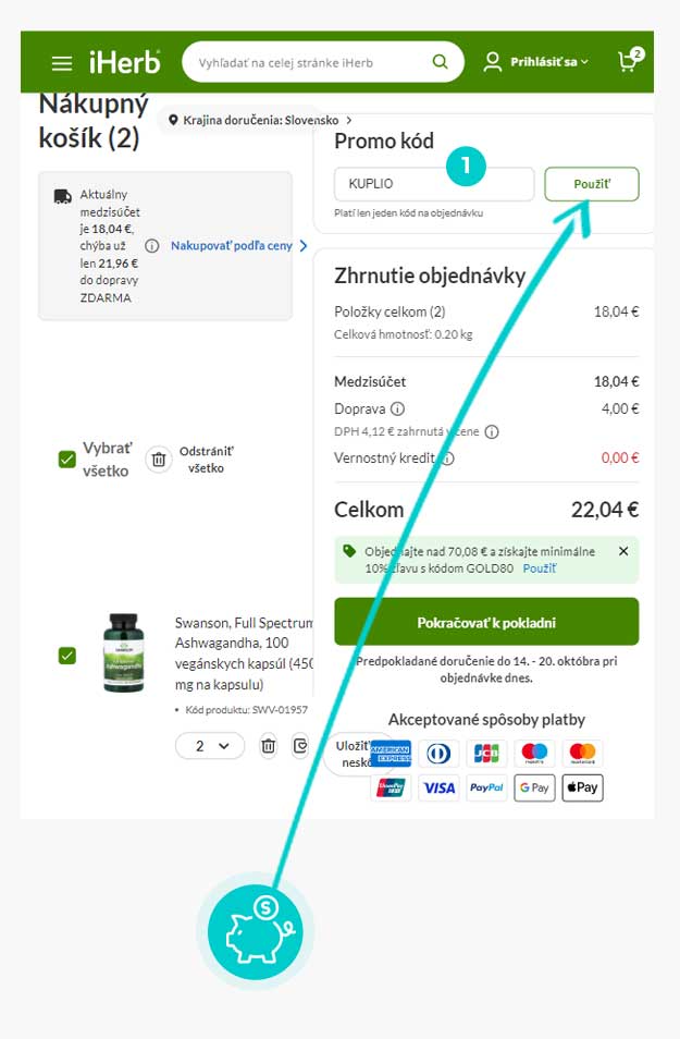 Vyberte si produkt v e-shope sk.iherb.com, o ktorý máte záujem, stlačte tlačidlo „Do košíka“ a produkt sa automaticky vloží do nákupného košíka. Priamo v nákupnom košíku nájdete v stĺpci na pravej strane políčko „Promo kód“. Tu vložte skopírovaný zľavový kód alebo ho ručne vpíšte a potvrďte tlačidlom „Použiť“.