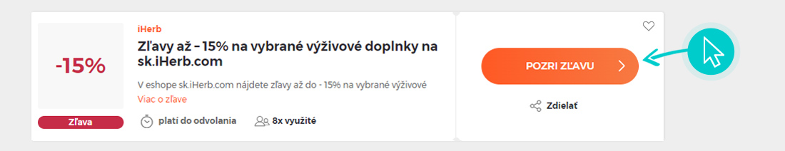 Vyberte si na našej stránke konkrétnu iHerb zľavu a kliknite na tlačidlo „Pozri zľavu“. Automaticky budete presmerovaný priamo na akciovú ponuku v internetovom obchode sk.iherb.com, kde môžete produkt nakúpiť so zľavou.