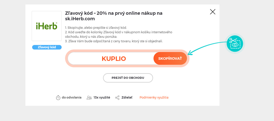 Skopírujte alebo si odpíšte zľavový kód a kliknite na tlačidlo „Prejsť do obchodu“. Následne budete presmerovaný priamo do e-shopu sk.iherb.com.