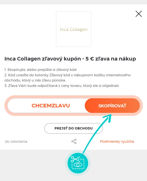 Skopírujte alebo si odpíšte zľavový kód a kliknite na tlačidlo „Prejsť do obchodu“. Následne budete presmerovaný priamo do e-shopu Incacollagen.sk.