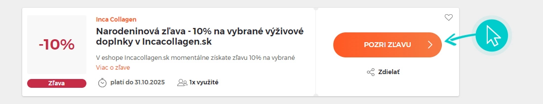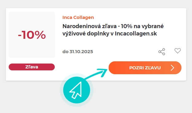 Vyberte si na našej stránke konkrétnu Inca Collagen zľavu a kliknite na tlačidlo „Pozri zľavu“. Automaticky budete presmerovaný priamo na akciovú ponuku v internetovom Incacollagen.sk, kde môžete produkt nakúpiť so zľavou.