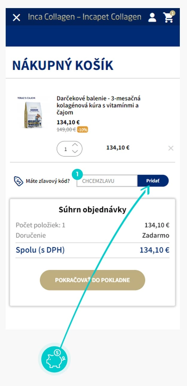 Vyberte si produkt v e-shope Incacollagen.sk, o ktorý máte záujem, stlačte tlačidlo „Do košíka“ a produkt sa automaticky vloží do nákupného košíka. Priamo v nákupnom košíku nájdete v prvom kroku objednávania pod zoznamom objednávaných produktov vľavo dole políčko „Máte zľavový kód?“. Tu vložte skopírovaný zľavový kód alebo ho ručne vpíšte a potvrďte tlačidlom „Pridať“.