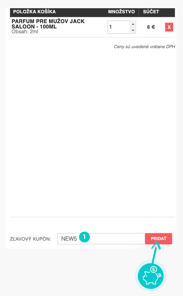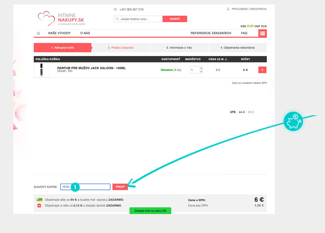 Vyberte si produkt v e-shope Intimnenakupy.sk, o ktorý máte záujem, stlačte tlačidlo „Do košíka“ a produkt sa automaticky vloží do nákupného košíka. Priamo v nákupnom košíku nájdete v prvom kroku objednávania pod zoznamom objednávaných produktov políčko „Zľavový kupón“. Tu vložte skopírovaný zľavový kód alebo ho ručne vpíšte a potvrďte tlačidlom „Pridať“.