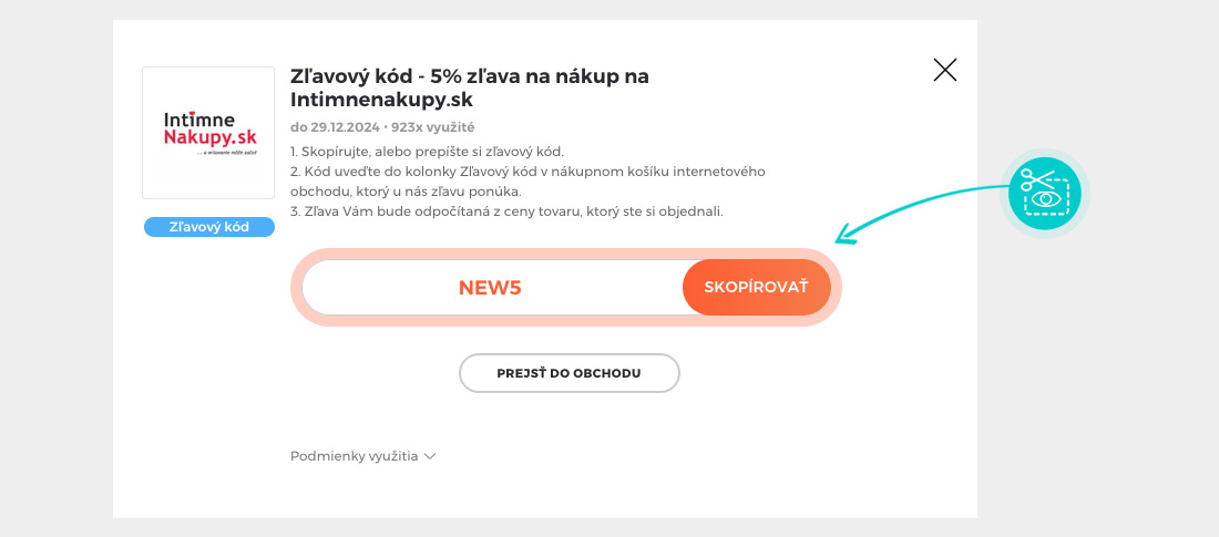 Skopírujte alebo si odpíšte zľavový kód a kliknite na tlačidlo „Prejsť do obchodu“. Následne budete presmerovaný priamo do e-shopu Intimnenakupy.sk.