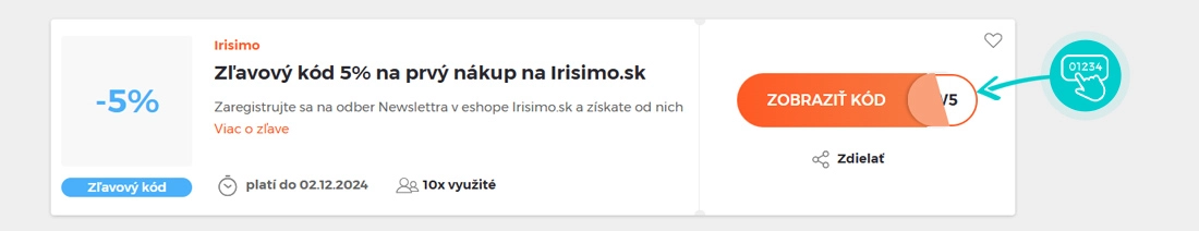 Vyberte si konkrétny zľavový kód na našej stránke, ktorý si chcete uplatniť v eshope Irisimo.sk. Kliknite na oranžové tlačidlo „Zobraziť kód“.