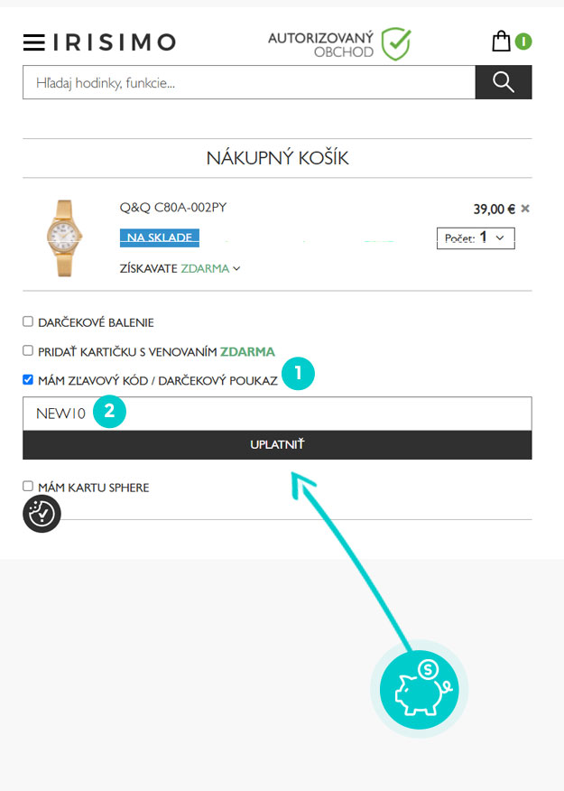 Vyberte si produkt v eshope Irisimo.sk, o ktorý máte záujem, stlačte tlačidlo „Do košíka“ a produkt sa automaticky vloží do nákupného košíka. Priamo v nákupnom košíku nájdete pod Vami vybraným produktom políčko „Mám zľavový kód / darčekový poukaz“. Tu vložte skopírovaný zľavový kód alebo ho ručne vpíšte a potvrďte tlačidlom „Uplatniť“.