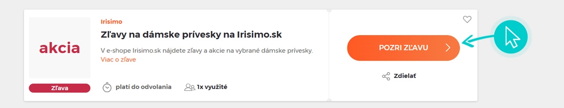 Vyberte si na našej stránke konkrétnu Irisimo zľavu a kliknite na tlačidlo „Pozri zľavu“. Automaticky budete presmerovaný priamo na akciovú ponuku v internetovom obchode Irisimo.sk, kde môžete produkt nakúpiť so zľavou.