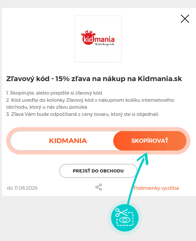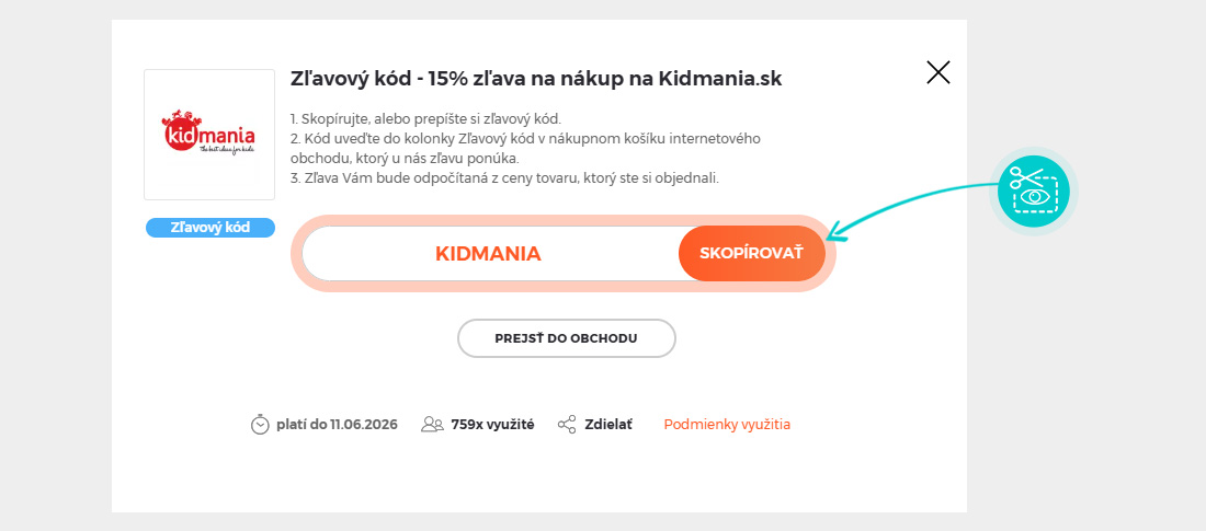 Skopírujte alebo si odpíšte zľavový kód a kliknite na tlačidlo „Prejsť do obchodu“. Následne budete presmerovaný priamo do eshopu Kidmania.sk.