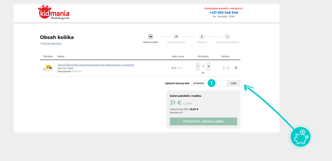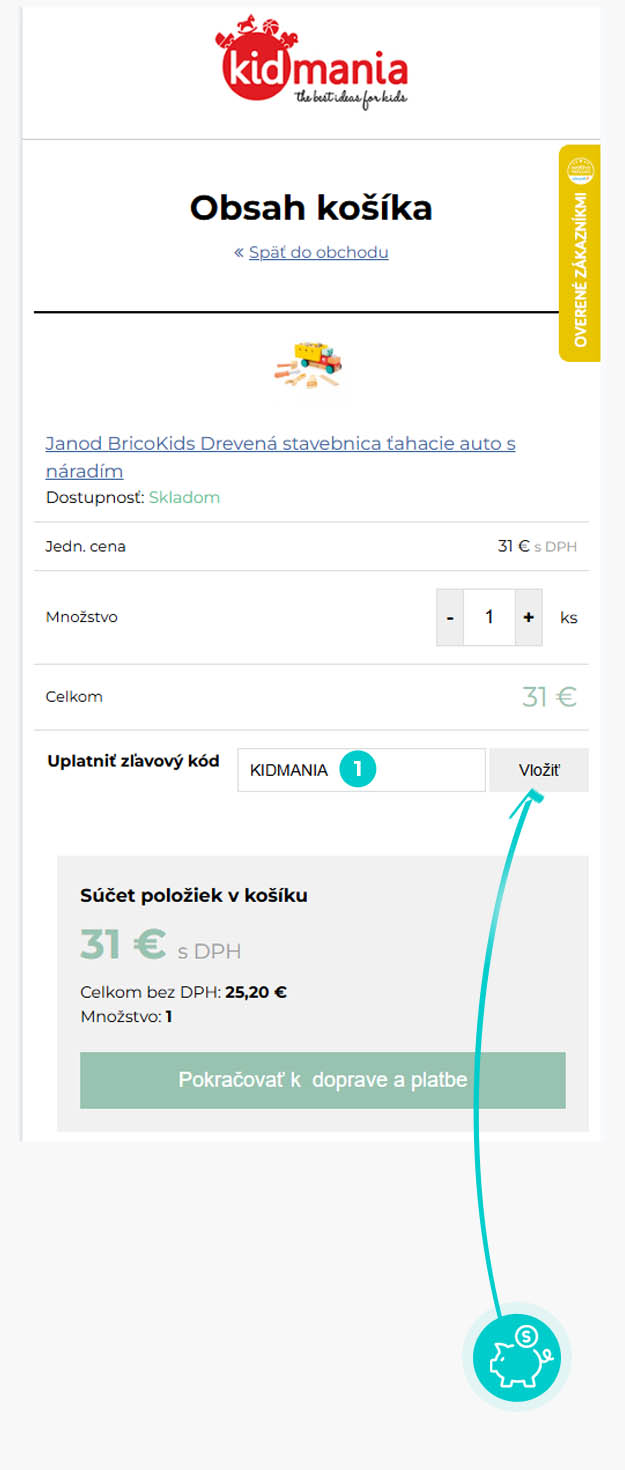Vyberte si produkt v eshope Kidmania.sk, o ktorý máte záujem, stlačte tlačidlo „Pridať do košíka“ a produkt sa automaticky vloží do nákupného košíka. Priamo v nákupnom košíku nájdete políčko „Uplatniť zľavový kód“. Tu vložte skopírovaný zľavový kód alebo ho ručne vpíšte a potvrďte tlačidlom „Vložiť“.