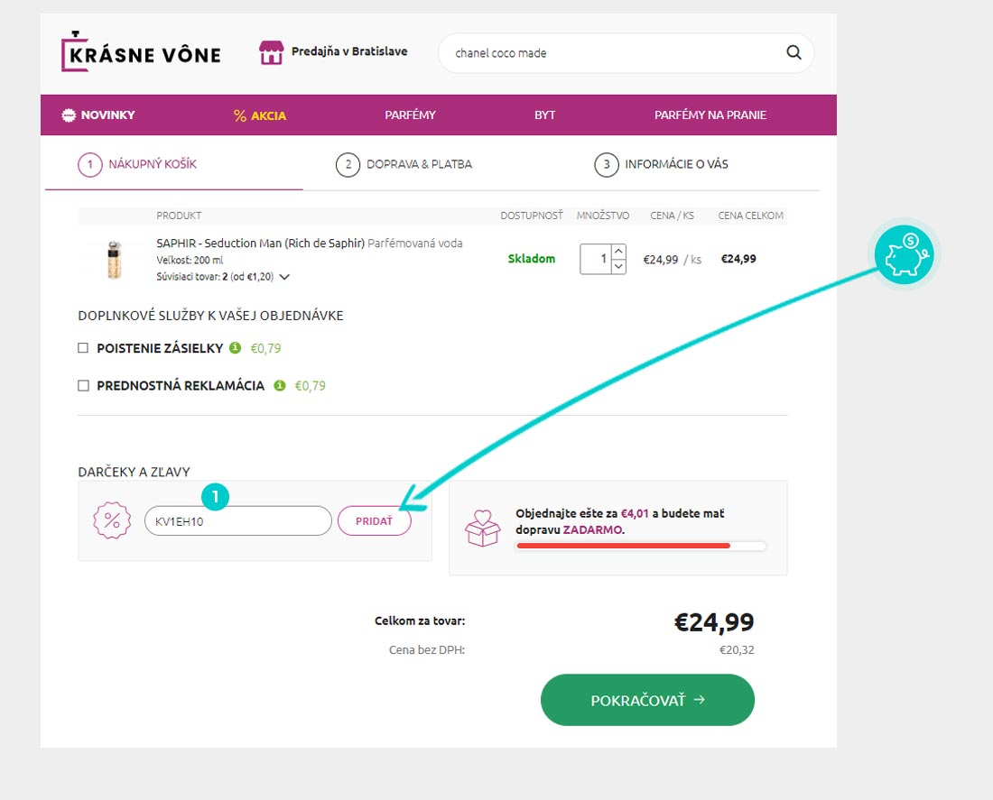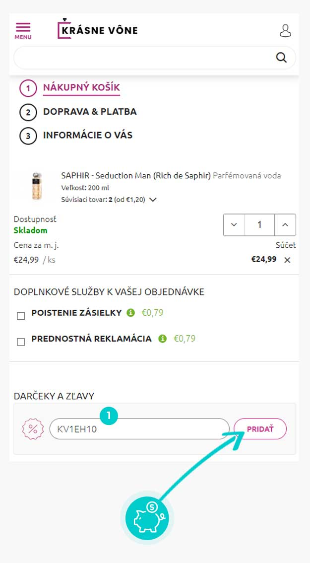 Vyberte si produkt v e-shope Krasnevone.sk, o ktorý máte záujem, stlačte tlačidlo „Do košíka“ a produkt sa automaticky vloží do nákupného košíka. Priamo v nákupnom košíku nájdete v prvom kroku objednávania pod zoznamom objednávaných produktov políčko „Vložiť kód“. Tu vložte skopírovaný zľavový kód alebo ho ručne vpíšte a potvrďte tlačidlom „Pridať“.