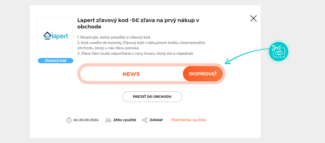 Skopírujte alebo si odpíšte zľavový kód a kliknite na tlačidlo „Prejsť do obchodu“. Následne budete presmerovaný priamo do e-shopu Lapert.sk.