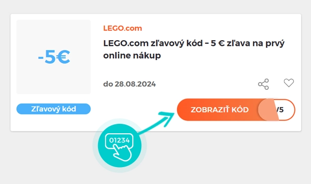 Vyberte si konkrétny zľavový kód na našej stránke, ktorý si chcete uplatniť v eshope Lego.com/sk-sk. Kliknite na oranžové tlačidlo „Zobraziť kód“.