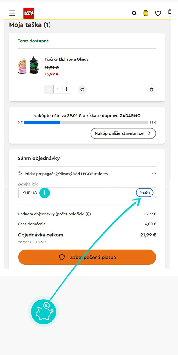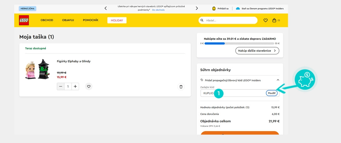 Vyberte si produkt v eshope Lego.com/sk-sk, o ktorý máte záujem, stlačte tlačidlo „Pridať do tašky“ a produkt sa vloží do nákupného košíka. Priamo v nákupnom košíku nájdete políčko „Pridať propagačný/zľavový kód“. Tu vložte skopírovaný zľavový kód alebo ho ručne vpíšte a potvrďte tlačidlom „Použiť“.