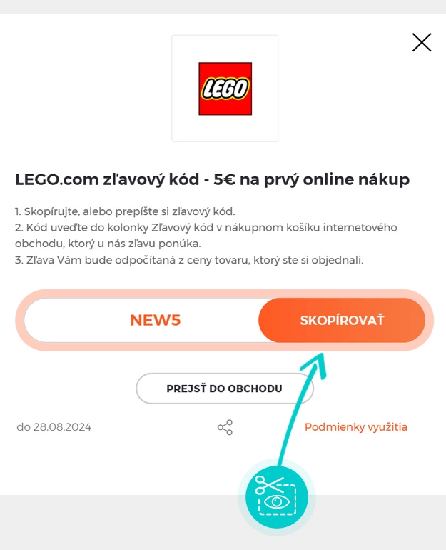 Skopírujte alebo si odpíšte zľavový kód a kliknite na tlačidlo „Prejsť do obchodu“. Následne budete presmerovaný priamo do eshopu Lego.com/sk-sk.