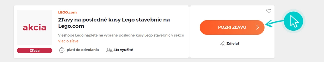 Vyberte si na našej stránke konkrétnu Lego.com zľavu a kliknite na tlačidlo „Pozri zľavu“. Automaticky budete presmerovaný priamo na akciovú ponuku v internetovom obchode Lego.com/sk-s, kde môžete produkt nakúpiť so zľavou.
