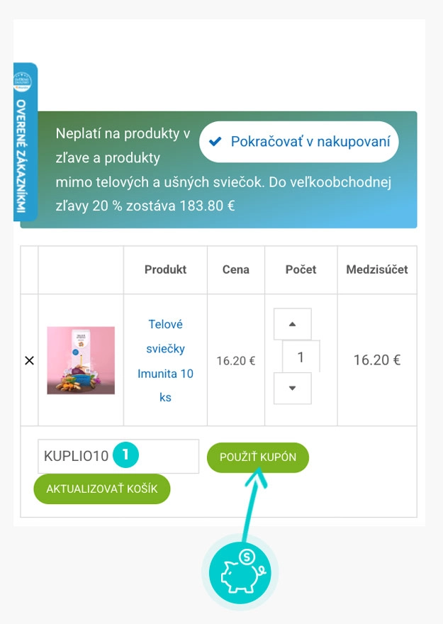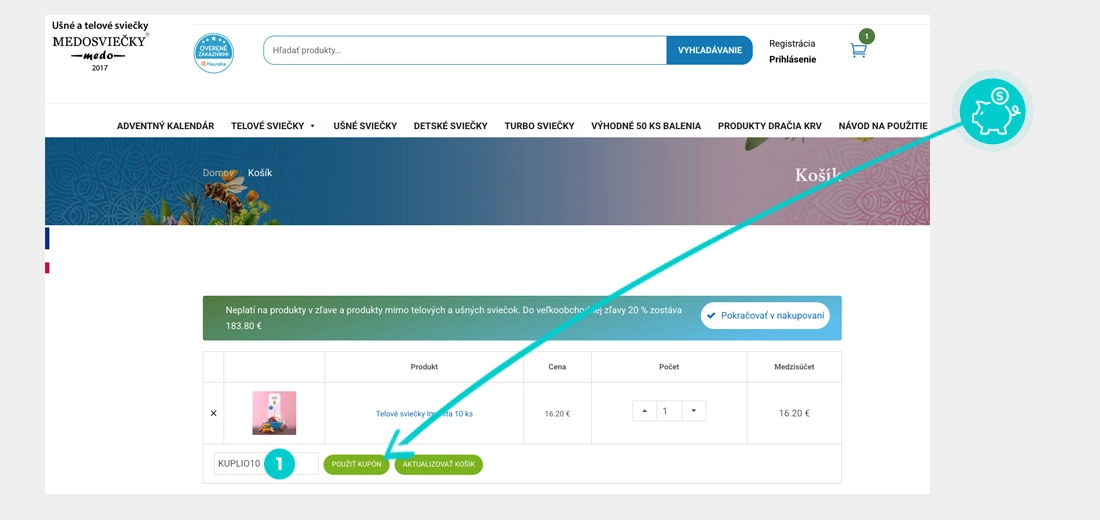 Vyberte si produkt v e-shope Medosvievky.sk, o ktorý máte záujem, stlačte tlačidlo „Pridať do košíka“ a produkt sa automaticky vloží do nákupného košíka. Priamo v nákupnom košíku nájdete pod Vami vybraným produktom políčko „Kód kupónu“. Tu vložte skopírovaný zľavový kód alebo ho ručne vpíšte a potvrďte tlačidlom „Použiť kupón“.