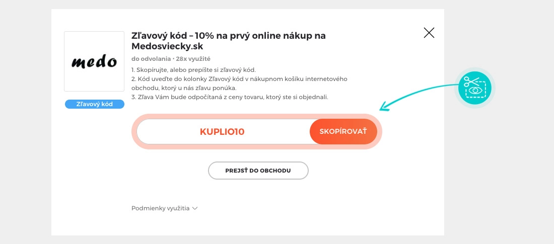 Skopírujte alebo si odpíšte zľavový kód a kliknite na tlačidlo „Prejsť do obchodu“. Následne budete presmerovaný priamo do e-shopu Medosvievky.sk.