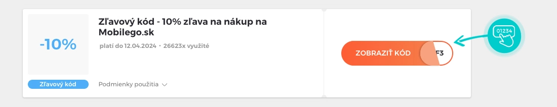 Vyberte si konkrétny zľavový kód na našej stránke, ktorý si chcete uplatniť v e-shope Mobilego.sk. Kliknite na oranžové tlačidlo „Zobraziť kód“.