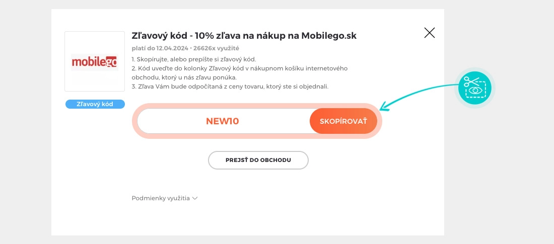 Skopírujte alebo si odpíšte zľavový kód a kliknite na tlačidlo „Prejsť do obchodu“. Následne budete presmerovaný priamo do e-shopu Mobilego.sk.