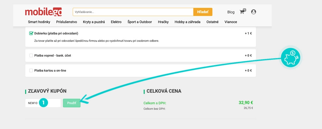 Vyberte si produkt v e-shope Mobilego.sk, o ktorý máte záujem, stlačte tlačidlo „Do košíka“ a produkt sa automaticky vloží do nákupného košíka. Priamo v nákupnom košíku nájdete v spodnej časti vľavo dole políčko „Zľavový kupón“. Tu vložte skopírovaný zľavový kód alebo ho ručne vpíšte a potvrďte tlačidlom „Použiť“.